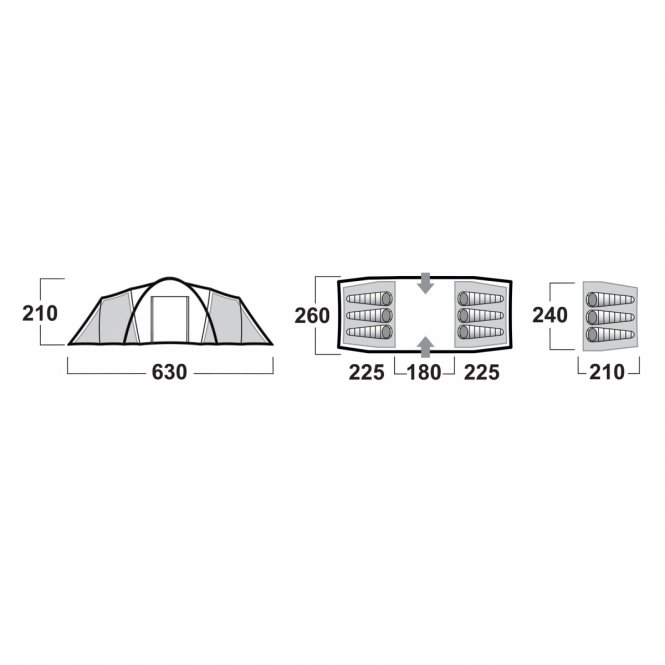 Uzceltas telts izmēri: platums: 260 cm, augstums: 200 cm, guļamās daļas garums: 130 cm, priekštelts garums: 220 cm.