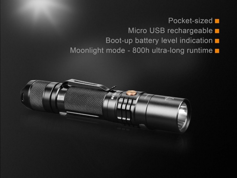 Fenix UC40 - uzlādējams kabatas lukturītis, kas strādā no 18650 akumulatora vai vienkāršas CR123 baterijas. Lukturīti var pielādēt ne tikai no barošanas, bet arī no datora USB porta.