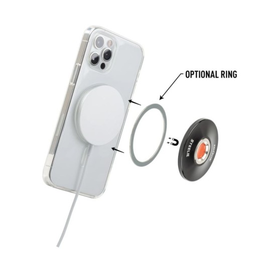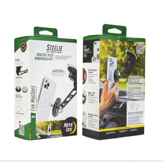 Steelie Orbiter Plus komplektā ietilpst Orbiter Plus magnētiskais stiprinājums, vējstikla stiprinājums un metāla gredzens. Orbiter Plus magnētiskais stiprinājums ir unikāli izstrādāts, lai izveidotu savienojumu ar MagSafe iPhone, futrāļiem un lādētājiem ar magnētiem iekšpusē. Tam ir jaudīgs neodīma magnēts un silikona centrs, kas nodrošina stingru noturību un vienmērīgu 360º rotāciju. Apple MagSafe lādētāja aizmugurē metāla gredzens, lai uzlādes laikā lādētāju varētu magnētiski piestiprināt pie kontaktligzdas.