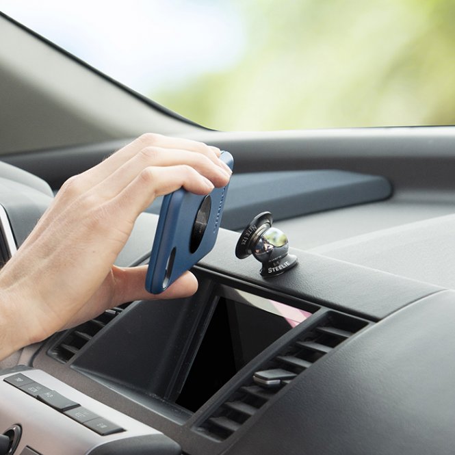 Steelie Dash Mount Kit ļauj ērti pievienot tālruni uz automašīnas paneļa un viegli pielāgot slīpuma leņķi. Komplektā ietilpst daļēji fiksēts stiprinājums pie paneļa un zema profila metāla plāksne, kas viegli piestiprinās tālruņa korpusām. Turētājs ar līmi 3M® VHB® droši piestiprinās pie jebkura automašīnas paneļa. Magnētiskā ligzda piestiprinās pie turētāja ar spēcīgu neodīma magnētu, bet silikona iekšpuse nodrošina drošu saķeri un vieglu rotāciju. Pateicoties šai kombinācijai, tālrunis tiek turēts drošā vietā vēlamajā leņķī. Kad kronšteins un magnētiskais gredzens ir piestiprināti pie paneļa, piestipriniet metāla plāksni tālrunim vai tā korpusam, un to var viegli piestiprināt pie kronšteina un izvēlēties vajadzīgo leņķi.
