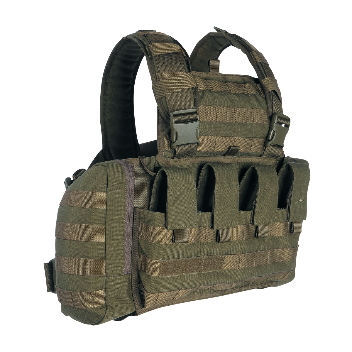Taktila veste ar regulējamām polsterētām siksnām. Divas ietilpīgas sānu kabatas (var ievietot 1 litru pudeli). Salokāma kabata bruņu plāksnei. Četri kabatas nodalījumi (G36, SIG, AUG, M4, M16, STG). MOLLE sistēma papildus piederumu un grozu piestiprināšanai. Izgatavots no 700D Cordura Nylon.