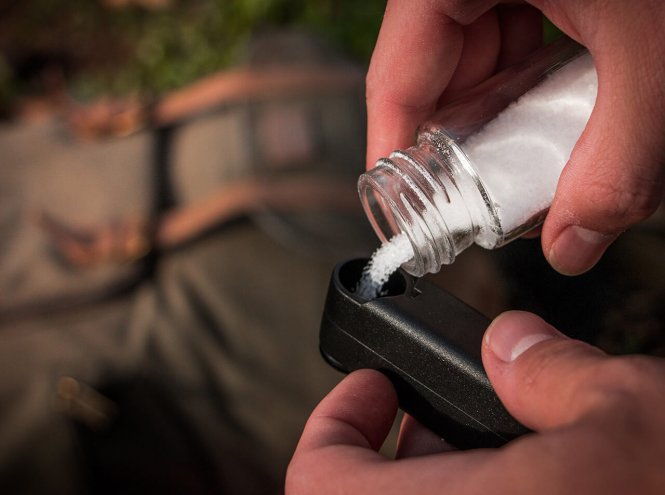 Kompakto komplektu var uzglabāt praktiskā sintētiskā maciņā, kas izgatavots no polipropilēna. Polipropilēns ir visu laiku vieglākā plastmasa un tajā pašā laikā ļoti izturīga. Tam ir arī sāls un piparu uzglabāšanas ietilpība.