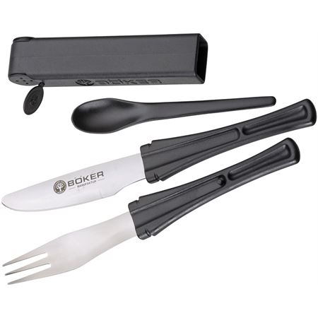 Böker Snac Pac ir ērts galda piederumu komplekts, kurā ietilpst: 420 nerūsējošā tērauda nazis, dakša un deserta karote.