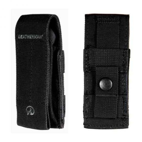 Этот черный нейлоновый чехол системы MOLLE имеет зажимной ремень, который крепится к задней части. Он имеет серый логотип Leatherman и застежку на липучке Velcro. У него также имеется внутренний карман для хранения насадки (строго к инструментам на 11 см).